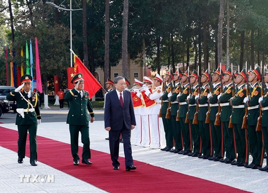 | Tổng Bí thư Tô Lâm đến dự Lễ kỷ niệm 80 năm Ngày truyền thống lực lượng vũ trang Quân khu 9 và đón nhận danh hiệu Anh hùng Lực lượng Vũ trang Nhân dân. (Ảnh: Thống Nhất/TTXVN) |