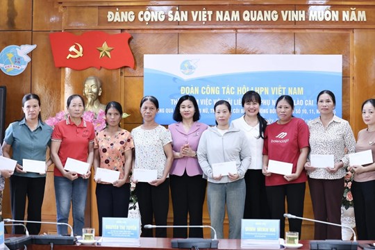 Ủy viên TƯ Đảng, Chủ tịch Hội LHPN Việt Nam Nguyễn Thị Tuyến (thứ 3 từ trái sang) và bà Trần Hồng Điệp, Giám đốc Quỹ Vì Tầm Vóc Việt (thứ 4 từ trái sang) trao hỗ trợ 100 suất quà cho hội viên, phụ nữ bị ảnh hưởng do bão số 10, 11 trên địa bàn tỉnh Lào Cai |