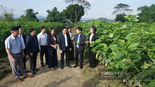 | Phó Chủ tịch Trung ương Hội Nông dân Việt Nam Nguyễn Xuân Định (thứ 2 bên phải) thăm mô hình trồng dâu nuôi tằm tại xã Trấn Yên, tỉnh Lào Cai. Ảnh: Hoàng Hữu |
