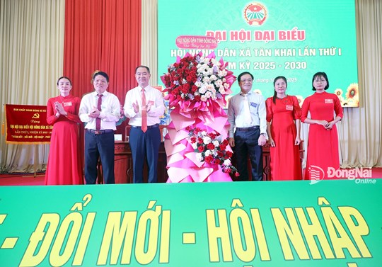 Lãnh đạo Hội Nông dân tỉnh Đồng Nai tặng hoa chúc mừng đại hội. Ảnh: Văn Hùng |