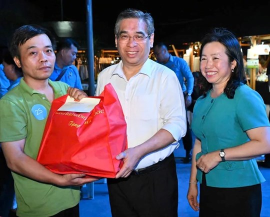 Ông Nguyễn Phước Lộc, Ủy viên Trung ương Đảng, Phó Bí thư Thành ủy, Chủ tịch Ủy ban MTTQ Việt Nam thành phố Hồ Chí Minh và bà Thái Thu Xương, Phó Chủ tịch Thường trực Tổng LĐLĐ Việt Nam trao quà đến công nhân tại chương trình. Ảnh: VIỆT DŨNG
