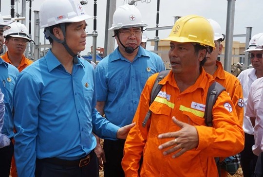 | Ông Nguyễn Đình Khang, Chủ tịch Tổng LĐLĐ Việt Nam thăm hỏi, động viên công nhân, lao động làm việc trên công trường đường dây 500 kV mạch 3 qua Thanh Hóa năm 2024. Ảnh: Tuấn Minh |