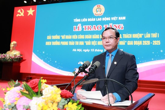 (Mặt trận) - Tối 15/10, Tổng liên đoàn Lao động Việt Nam đã tổ chức lễ trao Giải thưởng “Nữ đoàn viên Công đoàn năng động, sáng tạo, trách nhiệm” lần thứ I và sơ kết, khen thưởng phong trào thi đua “Giỏi việc nước, đảm việc nhà” giai đoạn 2020 -2025 cho 70 cá nhân, 20 tập thể.