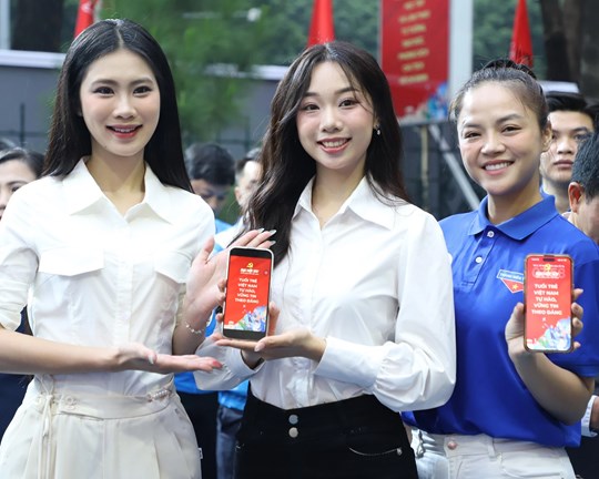 | Diễn viên Thu Quỳnh (bìa phải) và các bạn trẻ cùng thay hình nền điện thoại chào mừng Đại hội XIV của Đảng. Ảnh: Đăng Hải |