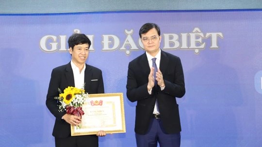 | Ông Bùi Quang Huy, Ủy viên Trung ương Đảng, Phó Chủ tịch Ủy ban Trung ương MTTQ Việt Nam, Bí thư thứ nhất Trung ương Đoàn trao giải đặc biệt cho tác giả Lý Anh Tuấn. Ảnh: Đăng Hải |